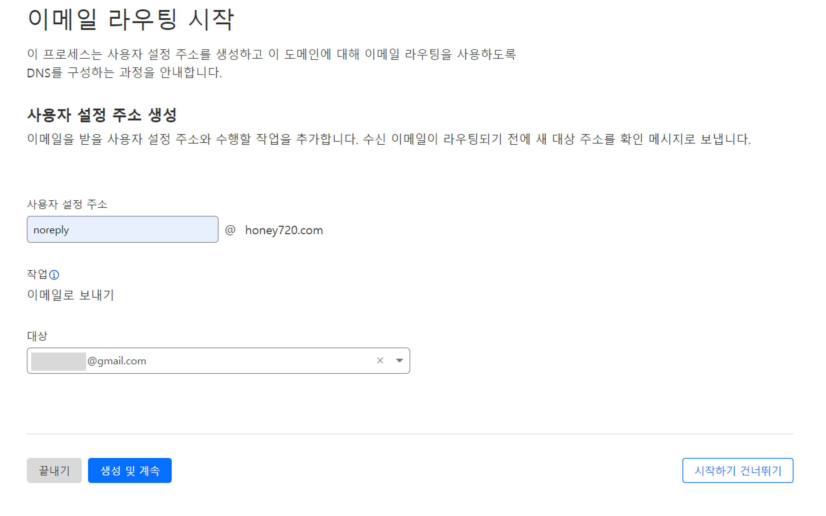 이름은 원하는 대로 작성하고 이메일 주소는 Cloudflare에서 추가한 사용자 지정 도메인을 입력하자.