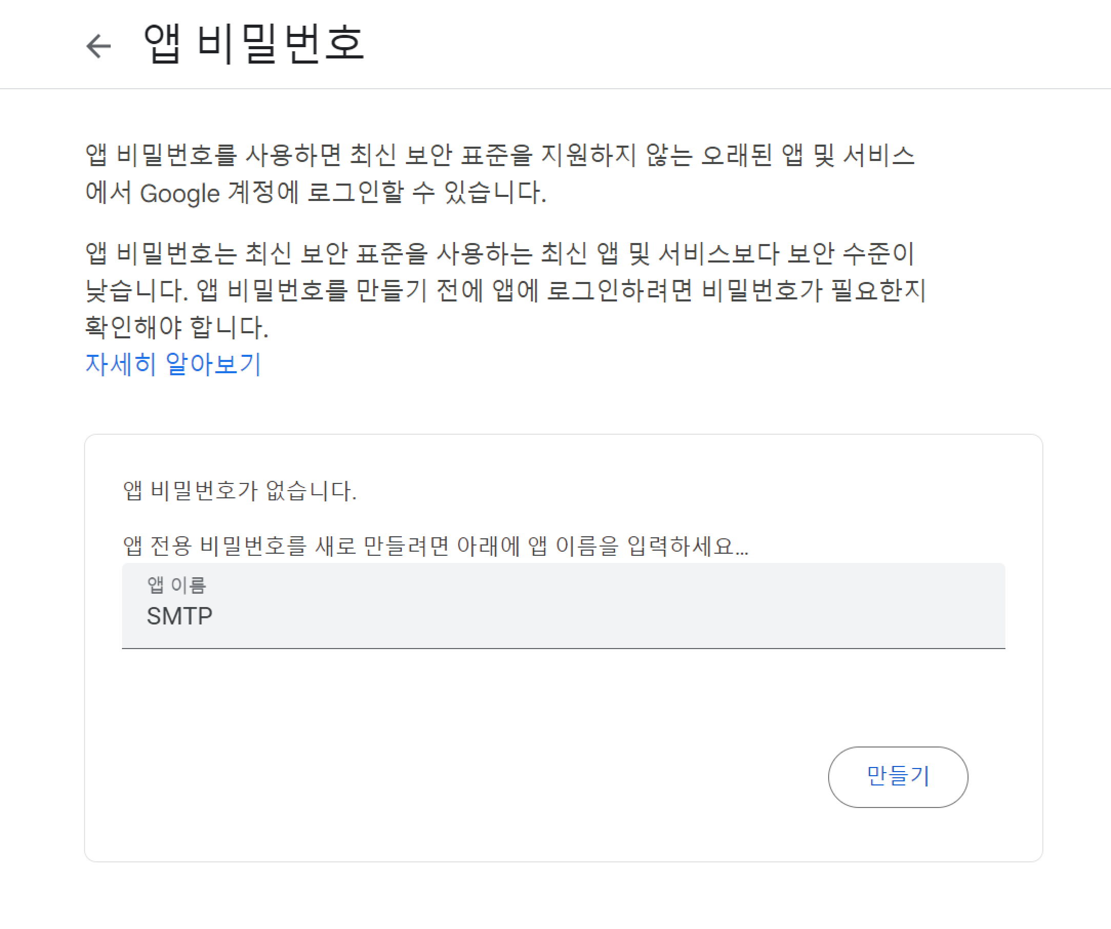 여기서 사용할 앱 이름을 입력하고 만들기버튼을 누르면 비밀번호가 생성된다.