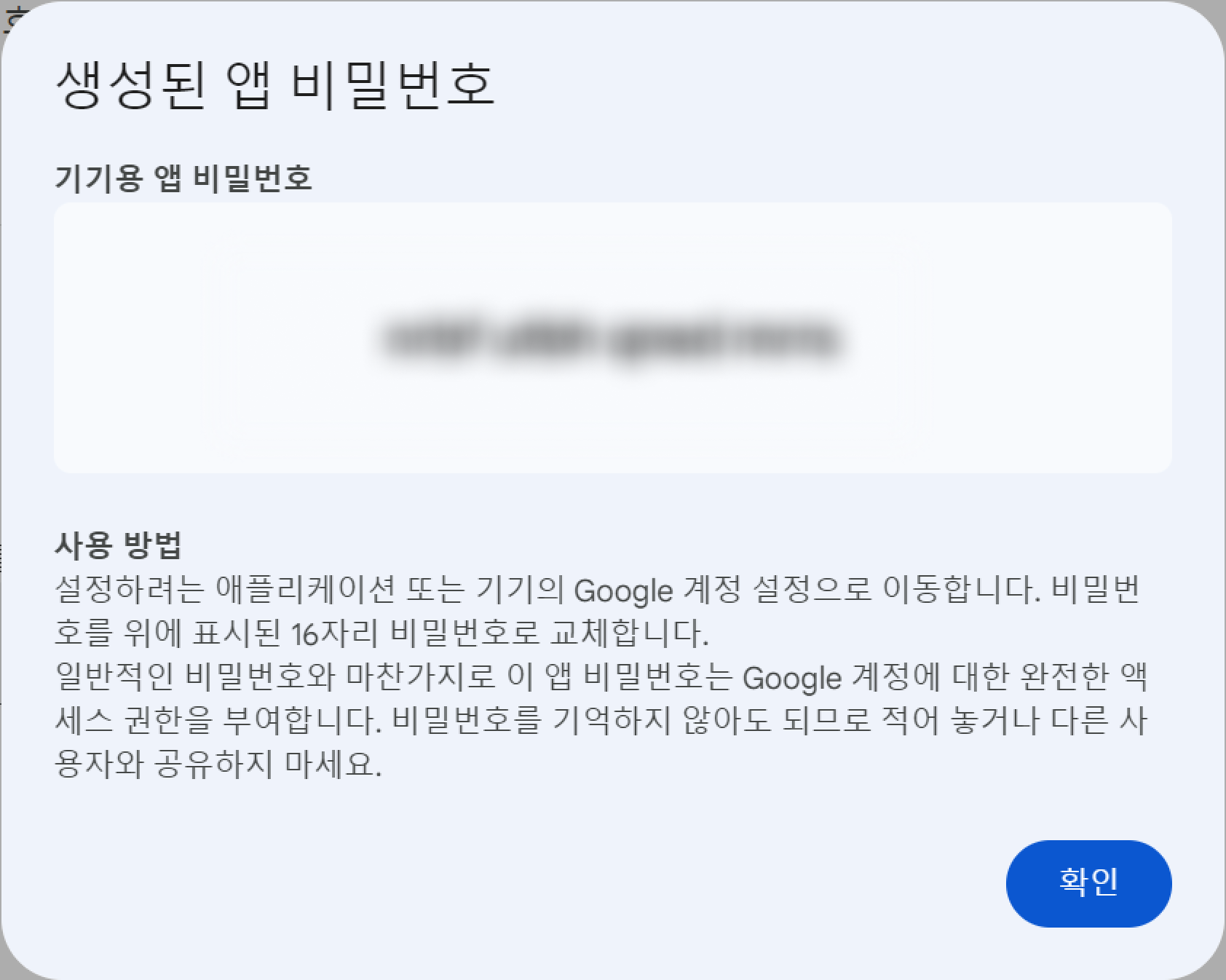 생성된 앱 비밀번호는 16자리 알파벳으로 이루어진다. 이 앱 비밀번호를 메모장에 적어 두자.