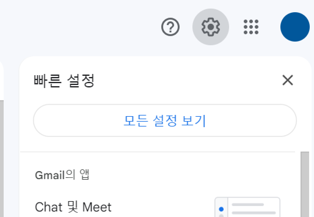 지메일 화면 상단의 톱니바퀴를 클릭하고 모든 설정 보기버튼을 눌러 설정 페이지로 들어가자.