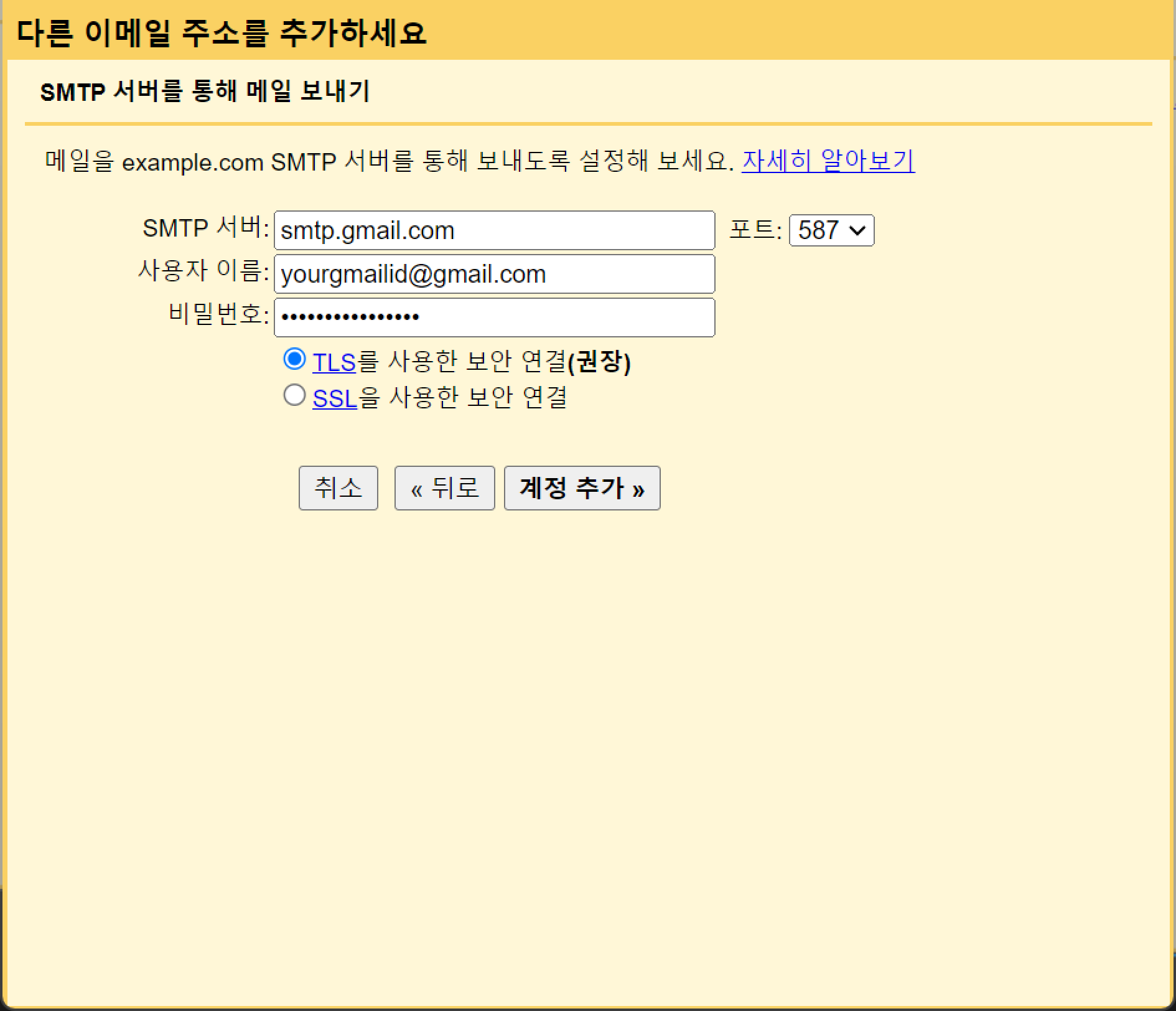 우리는 Gmail SMTP를 통해 메일을 전송할 것이므로 SMTP 서버에 smtp.gmail.com을 입력하면 된다.