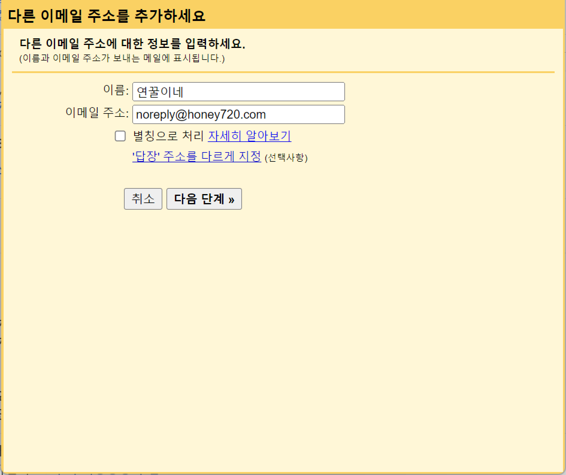 설정 탭에서 계정 및 가져오기 탭의 다른 주소에서 메일 보내기 항목에서 다른 이메일 주소 추가 버튼을 누르면 새 창이 뜨게된다.