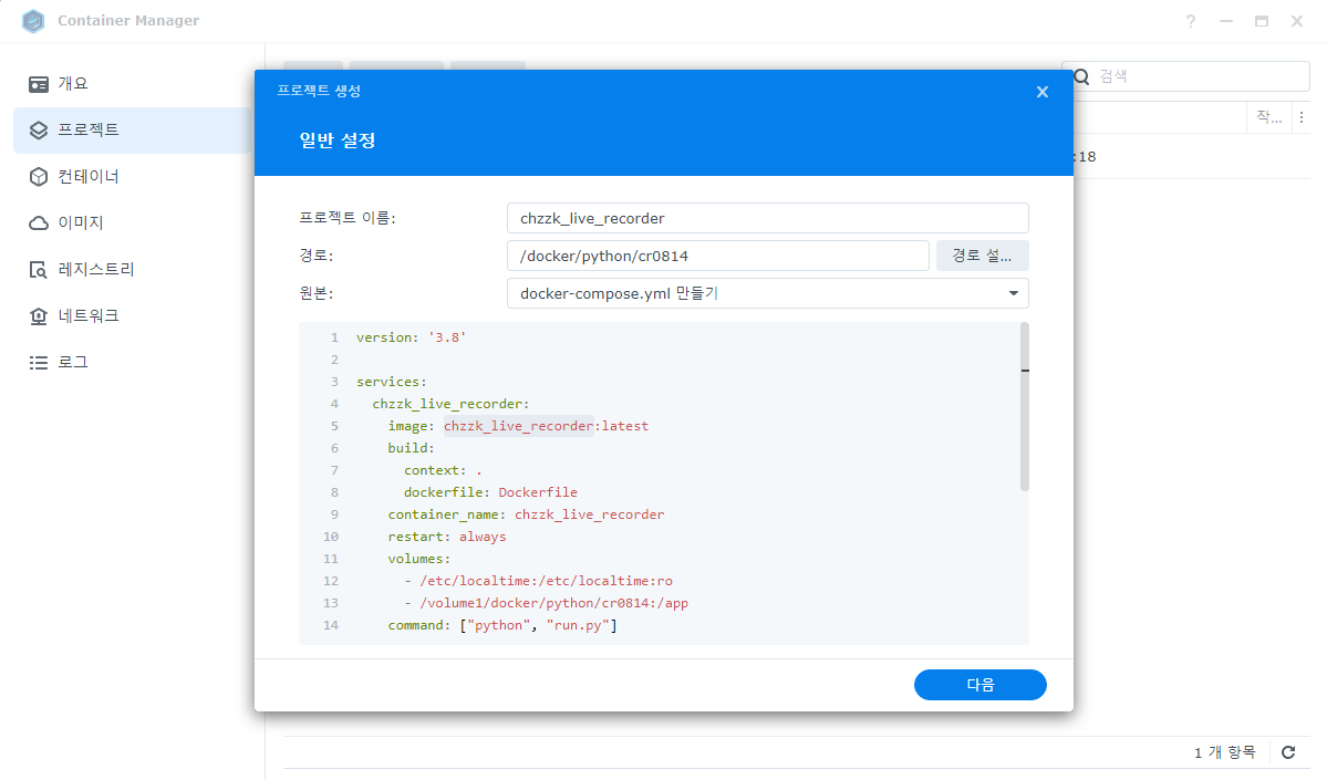 - /volume1/docker/python/cr0814:/app설정을 완료했으면 자동으로 컨테이너가 생성된다.