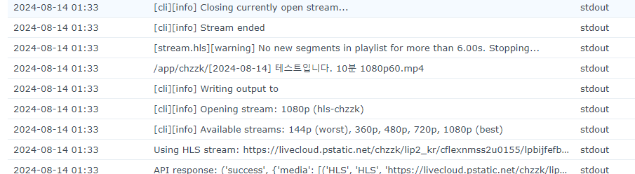 내 방송으로 테스트 해봤다. 방송이 시작되고 녹화가 시작되는 로그가 찍힌다.